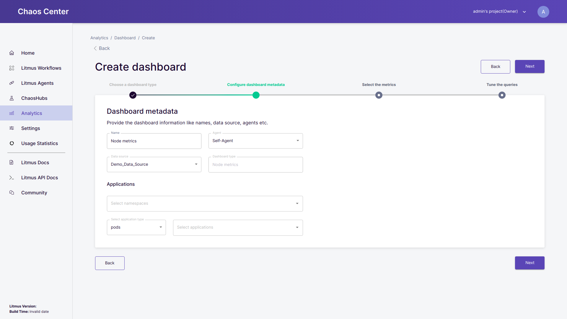 • chaos delegate: Select the chaos delegate for which you want to set up the dashboard. By default, an chaos delegate from the list of all connected chaos delegates is selected for you. You may override this as per your requirement.