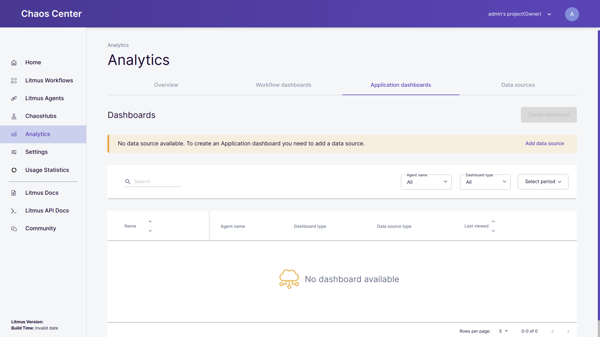 • If no data source is available, a banner on the application dashboard tab requests you to add it before configuring a dashboard.
