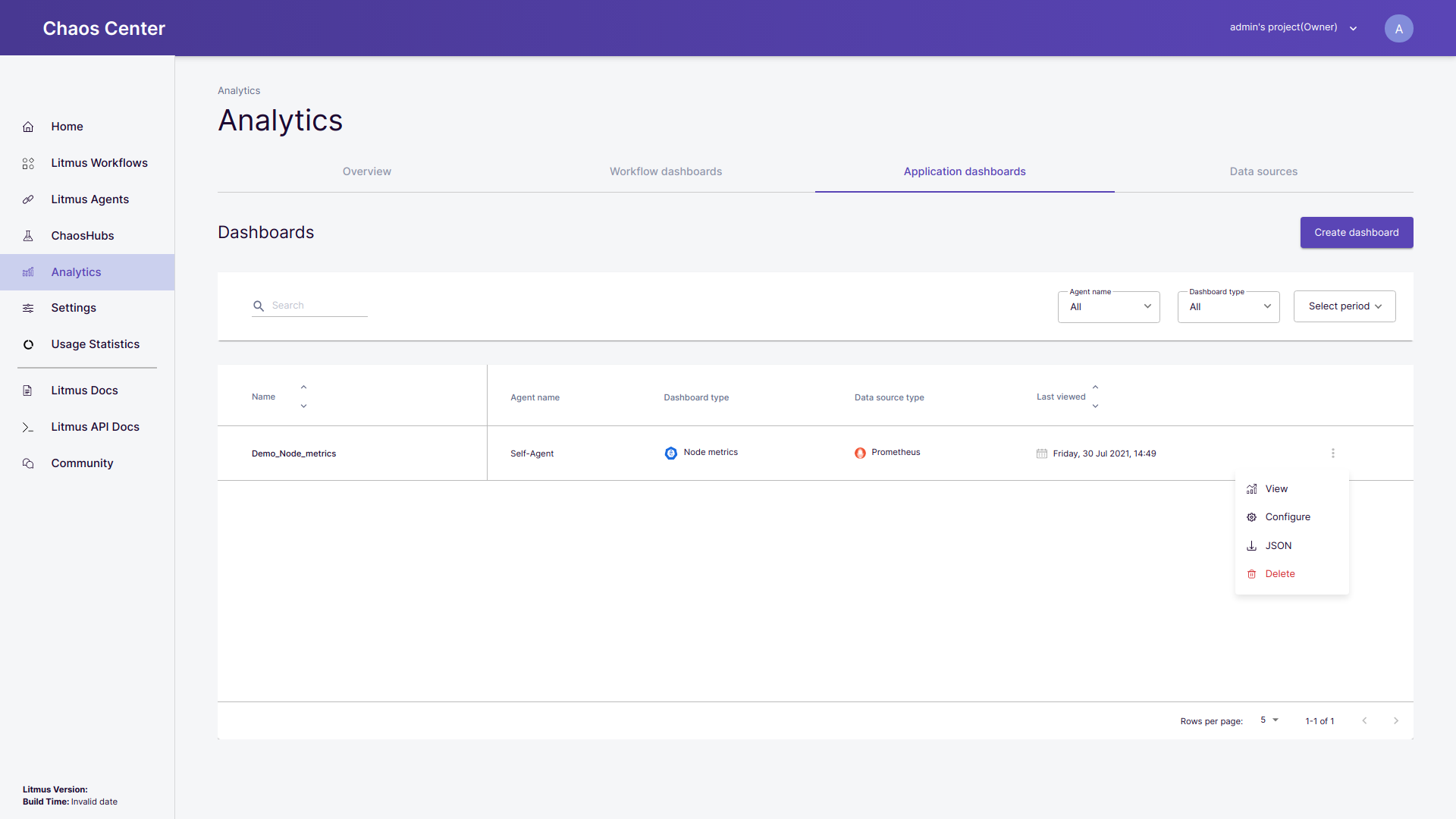 All the configured dashboards are listed under the Dashboards table. The table provides you all the details related to the dashboard like the name of the dashboard, the chaos delegate with which it has been connected, type of the dashboard, connected data source type and the last date it was opened.